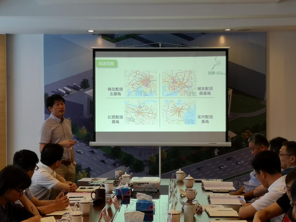 會議上,電子十一院季超院長介紹了城北主基地、城南副基地、城東副基地、江陰配送基地及宜興配送基地的設計方案和工程建設進展情況。蘇南食材公司羅志堅董事長匯報了配送基地建設方案及運營方案設想,并提出建立相關配套工作機制,健全完善應急保障預案。